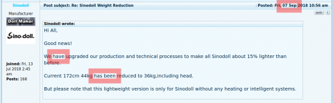 So everything we got from Sino-doll so far are narratives. It is very well possible that some of these narratives match with reality. But it is also possible that some of these narratives are mere fabrications or wishful thinking (like the weight specs). There is no way to tell unless you can fact-check every bit. You can not verify, before you buy. I can not verify, before I buy. If something changes, fact checking every bit needs to start from square one.