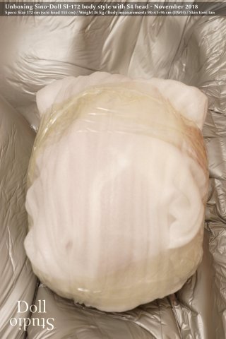 The doll's body is wrapped in a huge plastic bag; feet are extra packaged: