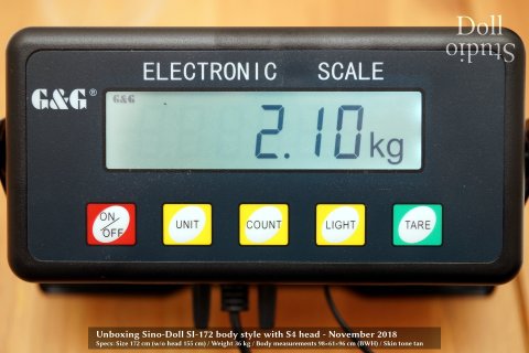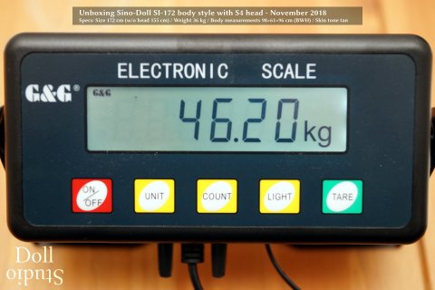 When the SI-172/H was introduced in August 2018, she was specified with a weight of 42 kg without head, which would result in a total weight of about 44 kg. That's not really heavy for a doll of this body height of body shape. Actually it'd be 'only' about 2/3 of a (even smaller) heavyweight TPE doll.